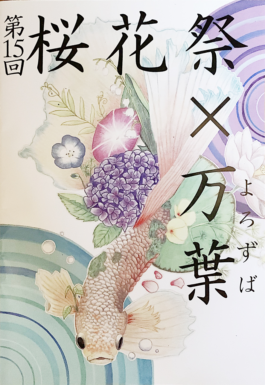 | 「万葉」 今年のテーマは「万葉」は「よろずば」と読みます。これは色々な個性を持った生徒たちが協力しあって1つの作品を作り上げる姿を、 万(よろず)の葉(は)からなる大きな大木と重ねています。また「万葉」は、令和の語源に深く関わる「万葉集」ともかけています。令和1発目の文化祭には令和という新たな道を歩んでいく私たちを写しています。 第15回桜花祭パンフレットより